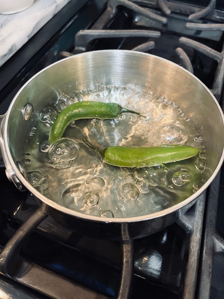 The serrano peppers start off a bright green. You will know they are done when they turn a lighter pale green. It usually takes about 10 minutes. I put my peppers on the stove and let them boil while I prepare the rest of my ingredients.