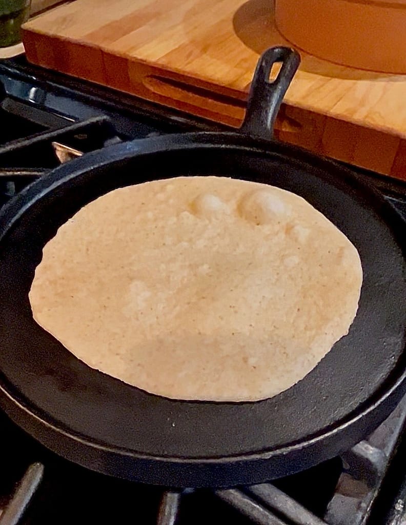 After you’ve rolled the dough into an 8-inch circle. Carefully, pick up the tortilla from the edge and place it on the tops of your hands. Very lightly stretch the tortilla once. Rotate and stretch again. I usually do this part as I’m moving toward my hot comal (griddle). Then, carefully place on a hot (between 475°F-525°F) griddle. Be careful here. This griddle is hot! You don’t want to burn yourself. As soon as you get the tortilla on the griddle give it a small back and forth movement.